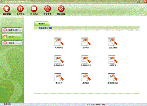 进销存连锁查询端:主要可以查询出所有分店营业情况的汇总和所有分店的库存、业务情况。也可以单独的查询某个分店的往来帐务、业务排行、营业情况等。