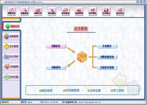 进货管理:进行商品采购入库,采购退货,进/退单据和当前库存查询,与供货商的往来帐务。