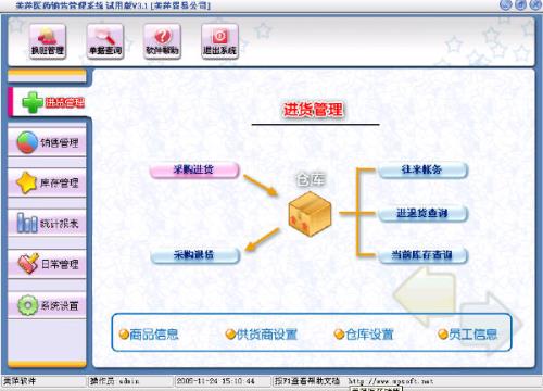 进货管理:进行商品采购入库,采购退货,进/退单据和当前库存查询,与供货商的往来帐务。
