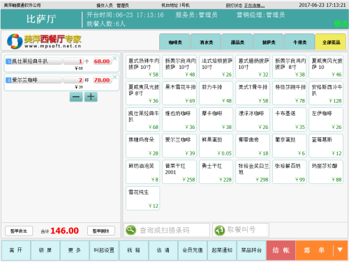 美萍西餐厅专家管理系统标准版是一款专为西式餐饮企业设计的触摸屏管理软件,可完全脱离键盘鼠标进行全触屏操作,界面简洁、操作直观、技术成熟,完全切合行业特点,无需培训,更优点单流程,点单结账更快2秒,方便强大的餐台功能,彻底解决点餐中的困扰,让餐饮收银真正又快又好;后台有完善的商品管理和强大的报表统计,让您的管理真正简单到底!广泛适用于中小型西餐厅、咖啡厅等餐饮企业